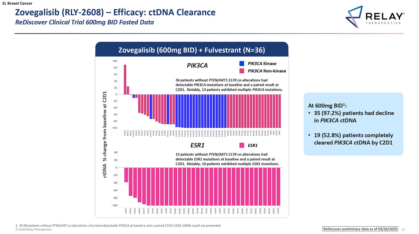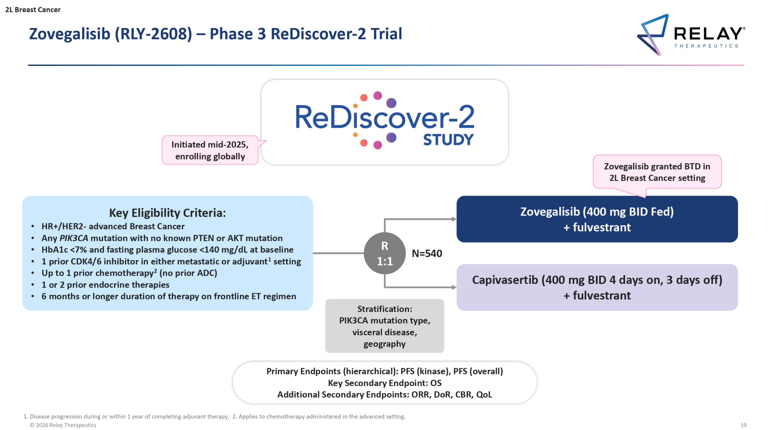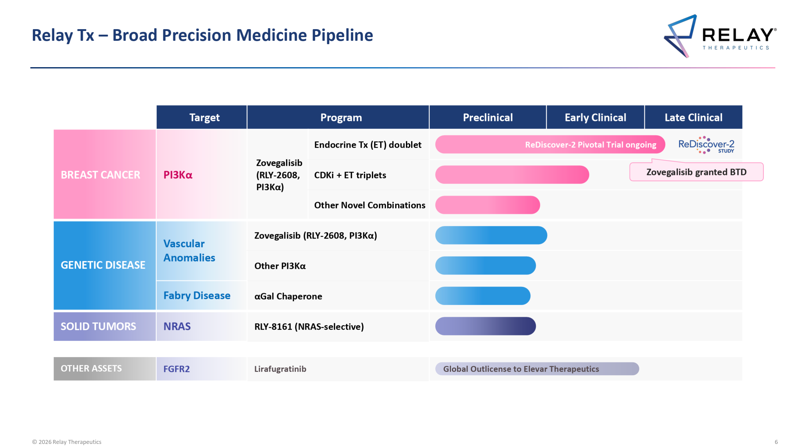 Relay Therapeutics (Nasdaq: RLAY) is a clinical-stage, small molecule precision medicine company developing potentially life-changing therapies for patients living with cancer and genetic disease. Relay's Dynamo® platform integrates an array of leading-edge computational and experimental approaches designed to drug protein targets that have previously been intractable or inadequately addressed. The company’s lead clinical asset, zovegalisib, is the first pan-mutant selective PI3Kα inhibitor to enter clinical development and is currently in a Phase 3 clinical trial (ReDiscover-2) in HR+/HER2- metastatic breast cancer. Zovegalisib is also being investigated in a group of genetic disease indications called PI3Kα-driven vascular anomalies. Relay's pipeline also includes programs for NRAS-driven solid tumors and Fabry disease. For more information, please visit www.relaytx.com