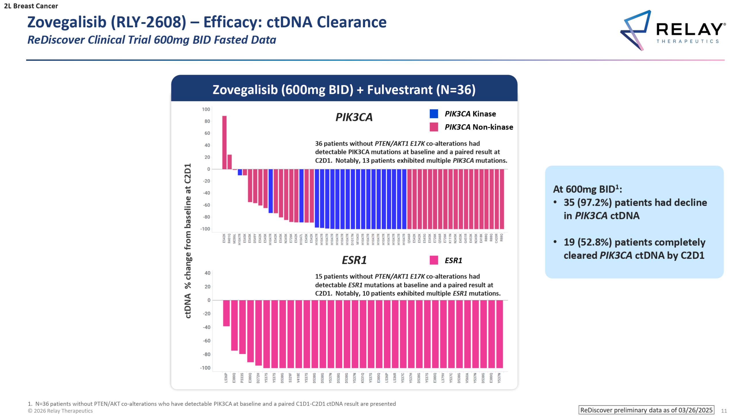For RLAY, success means ASCO clearly validating that the 400 mg fed regimen reproduces or approximates the original 10.3-month signal and positions zovegalisib as best-in-class within the PI3K pathway. A durable and clinically meaningful dataset would strengthen confidence entering ReDiscover-2 and mechanically lift program-level PoS assumptions.