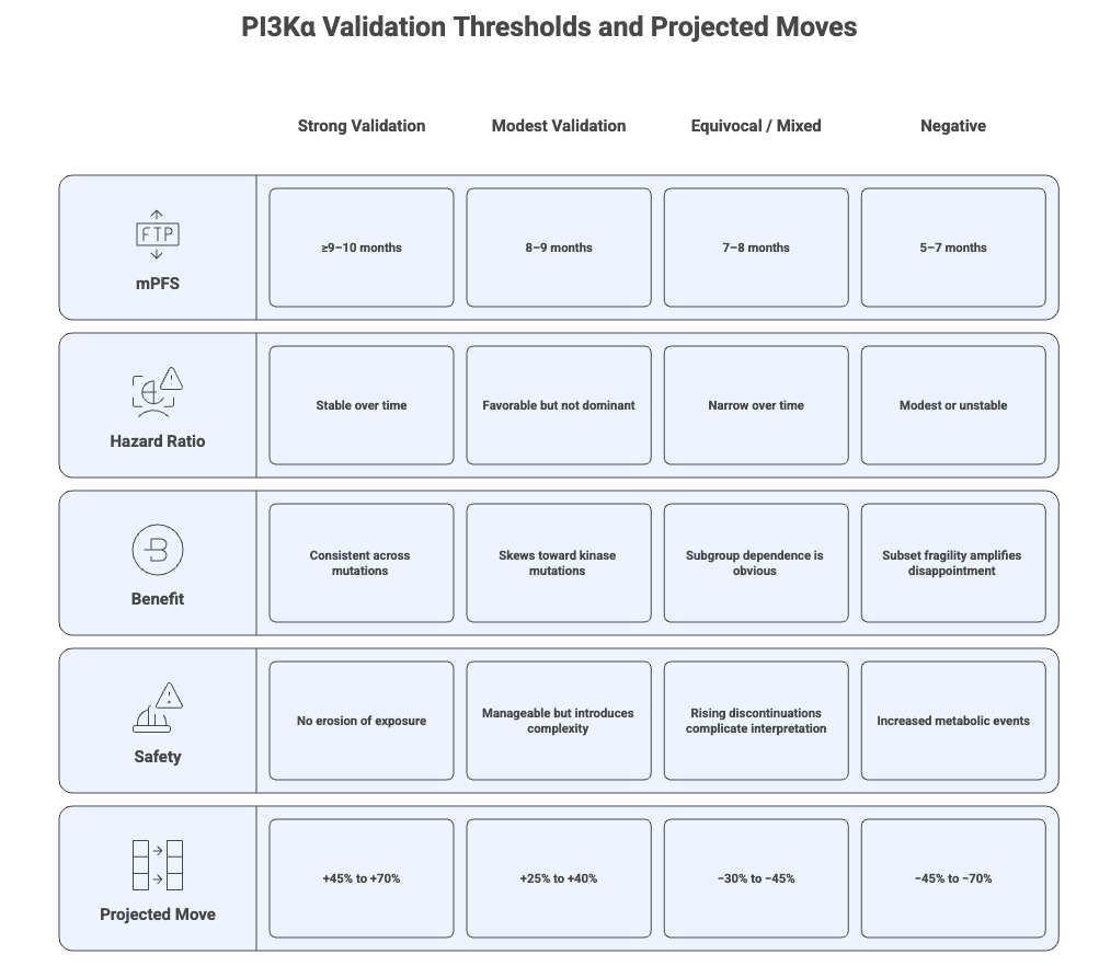 If the update is mixed, statistically positive but compressed toward 7–8 months, with early separation and later curve convergence or mutation-dependent benefit, investors are likely to fade the differentiation narrative. In CDK4/6-experienced oncology, magnitude and durability matter more than technical success. A marginal win reinforces the view that PI3K pathway inhibition in this setting has a structural ceiling.