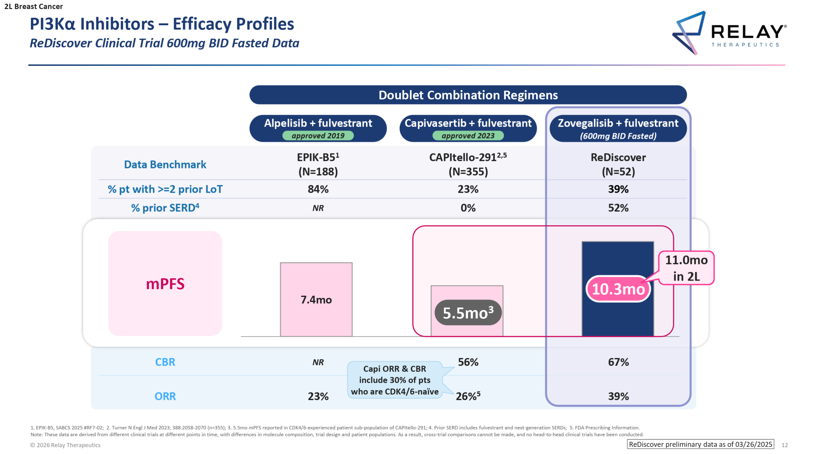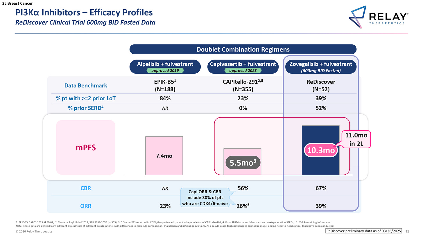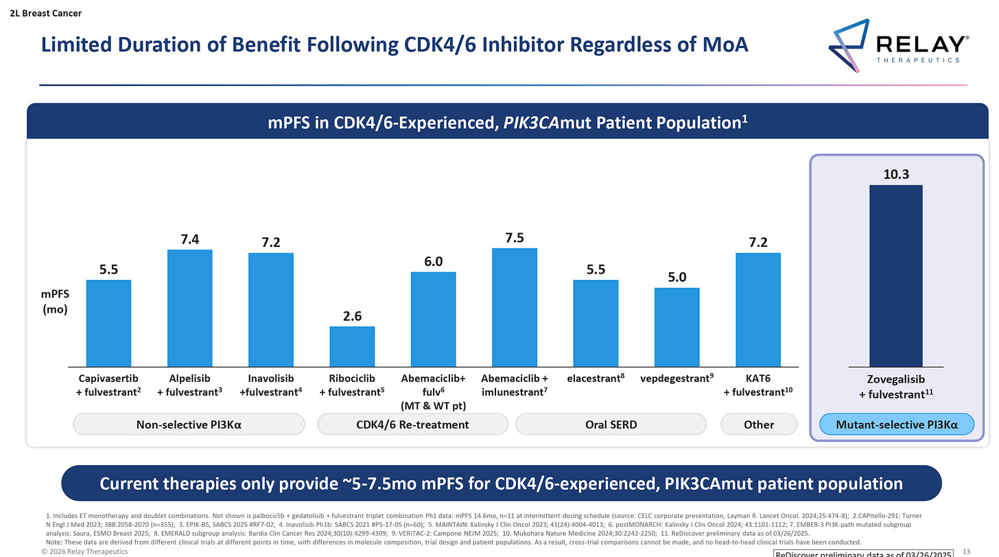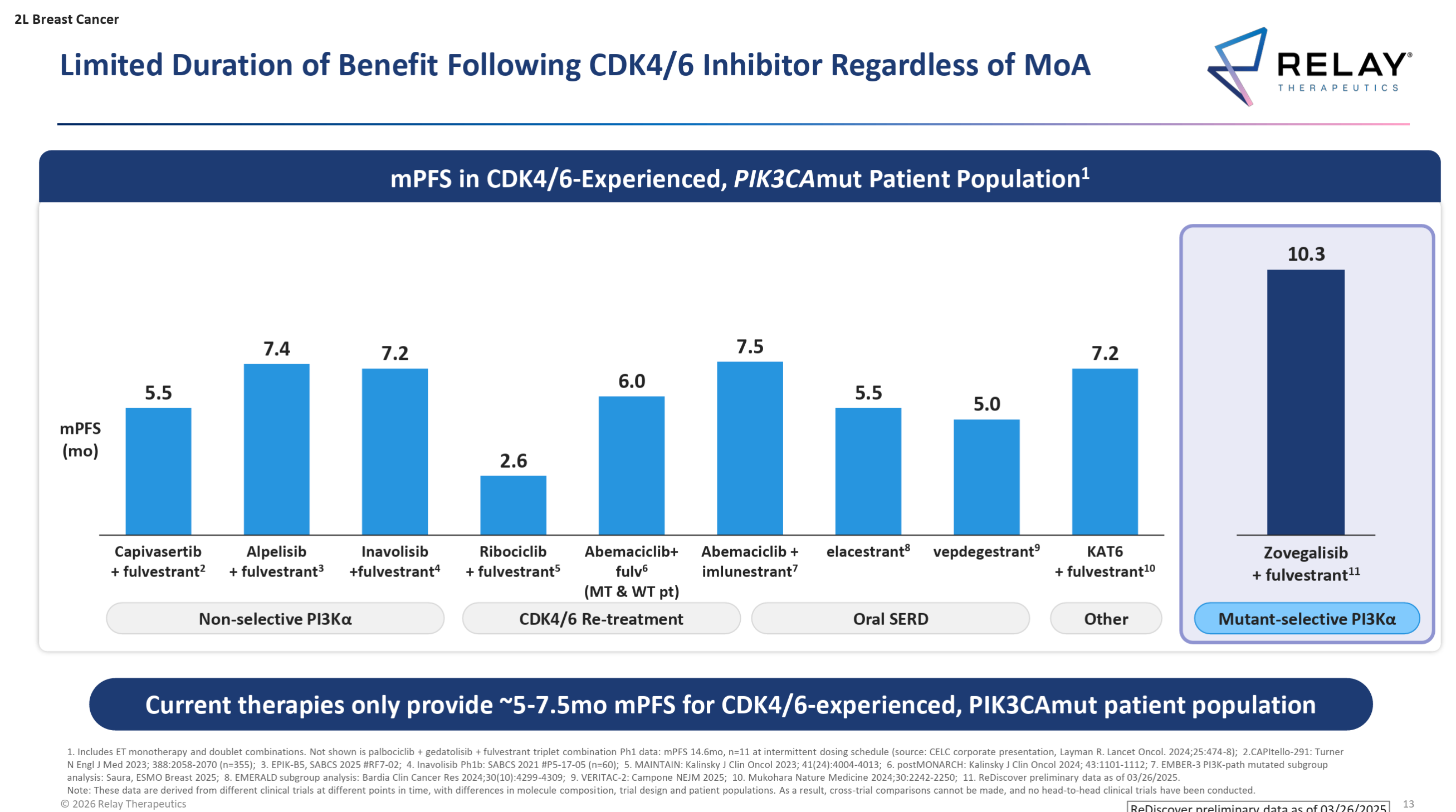 RLAY’s setup into ASCO June 2026 is ultimately simpler than the broader PI3K pathway debate. The catalyst does not need to re-prove that PI3Kα inhibition works; it needs to demonstrate that mutant-selective PI3Kα suppression at 400 mg BID fed can meaningfully extend 2L PFS beyond the historical 5–7 month ceiling and establish clear differentiation versus capivasertib.