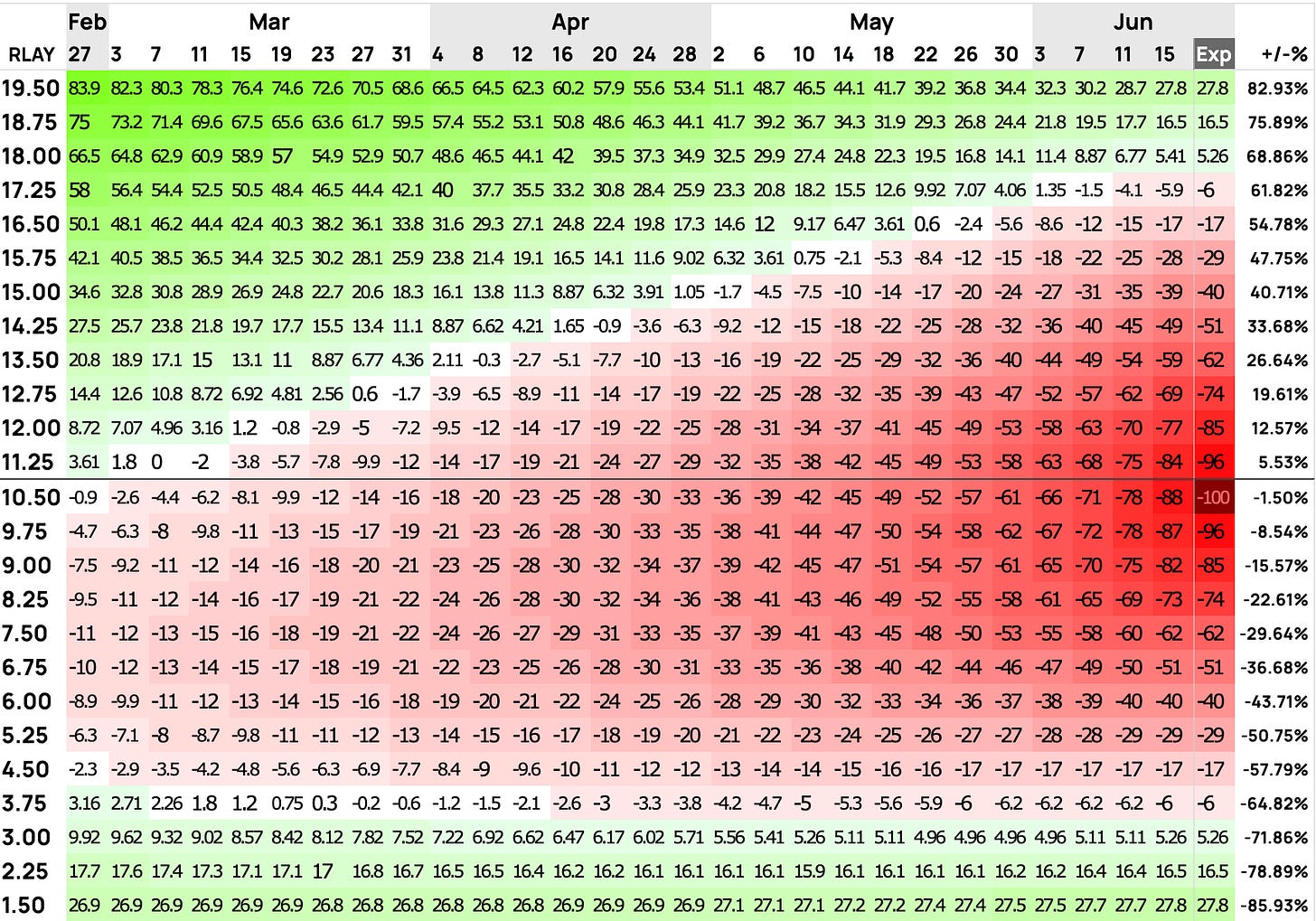 There is no visible wall at $18–$20 or extreme OTM lottery clustering. The upside positioning is laddered through $10–$14, implying traders are underwriting a reversion into the low-to-mid teens rather than pricing a blowout move back to prior cycle highs. This looks like controlled upside optionality, not squeeze-driven convexity.
