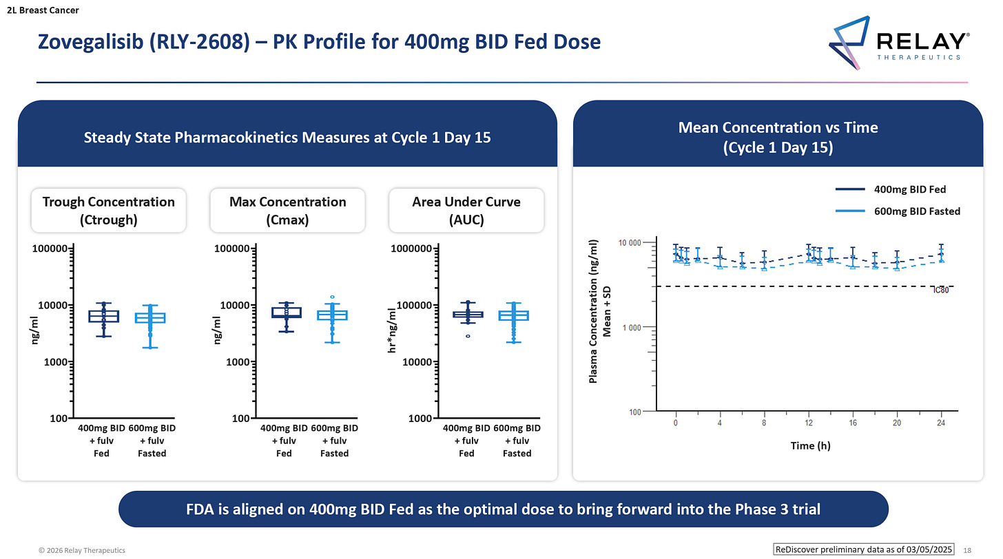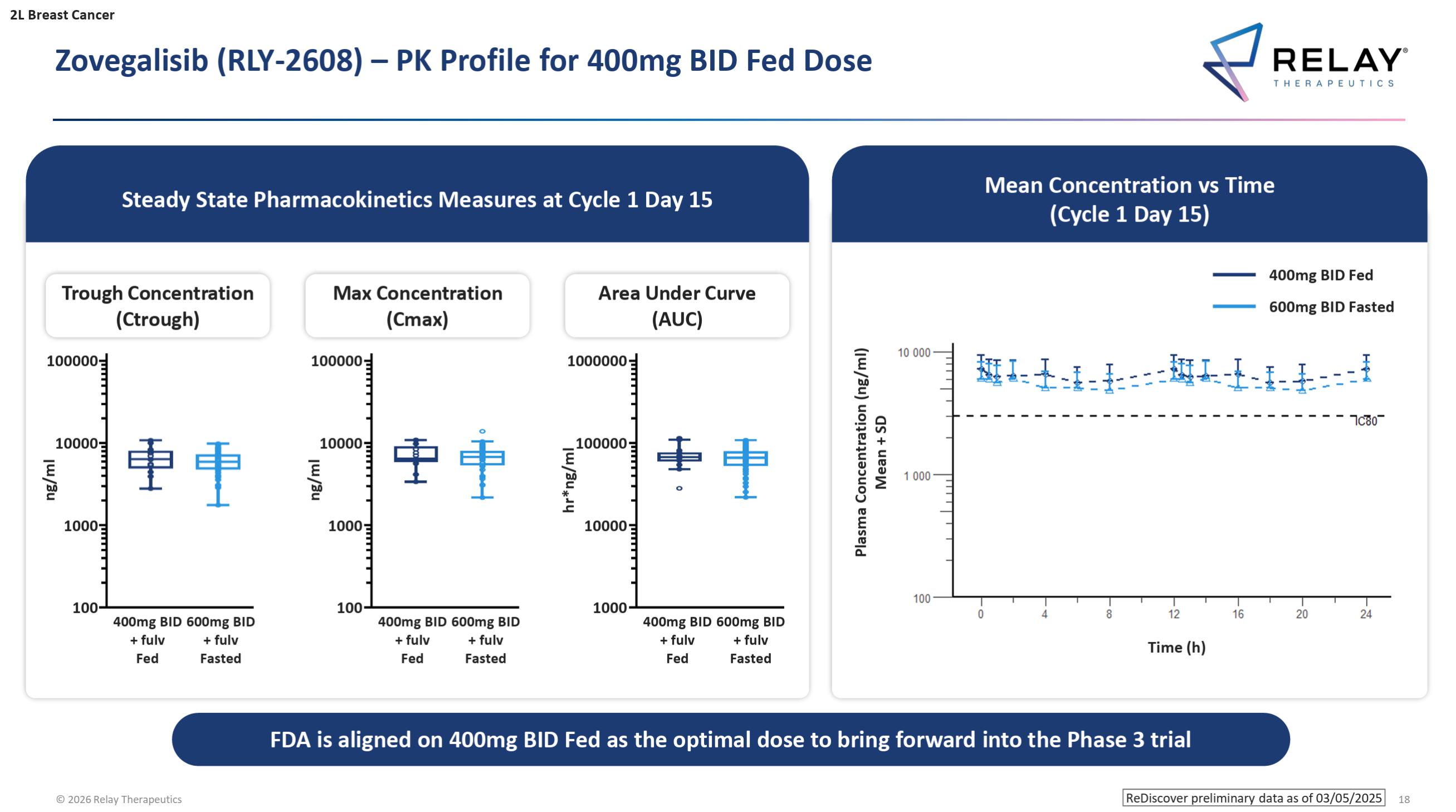 Steady-state pharmacokinetic measures show that 400 mg BID fed achieves exposure comparable to 600 mg BID fasted, with similar trough concentrations and AUC at Cycle 1 Day 15. FDA alignment on 400 mg fed as the pivotal dose reduces dose-bridging uncertainty and supports the argument that Phase 3 exposure should approximate the earlier efficacy dataset. Directionally, this meaningfully de-risks one common development failure mode.